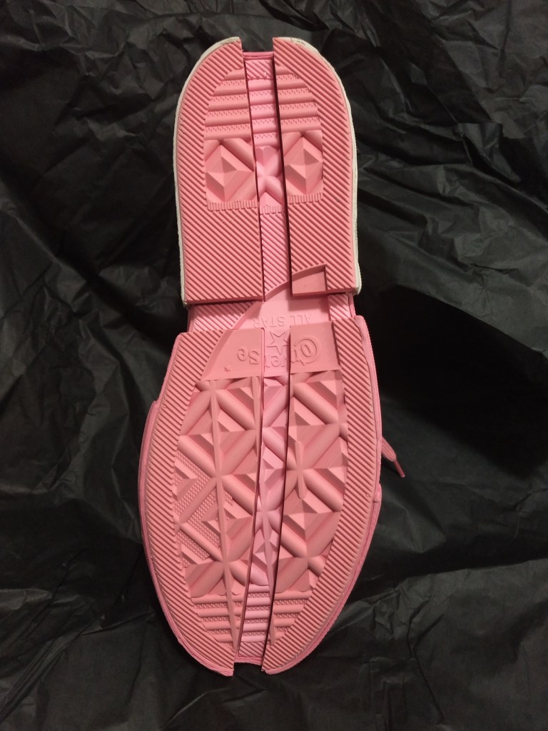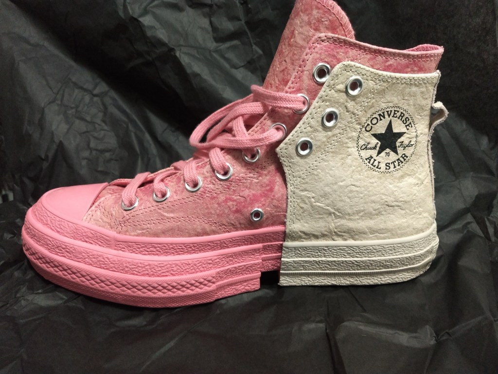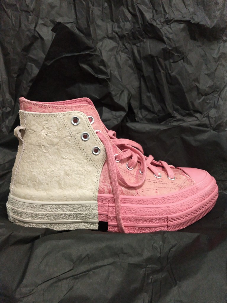 Each shoe has a double layered sole and outer layer and was constructed by hand prior to their first showing. The classic Chuck Taylor was reformed in a way that demonstrated the concept of halves, human connection, and a sense of completion, themes which ran through her Spring Summer 19 runway show. For the show, the shoes were constructed by hand.
