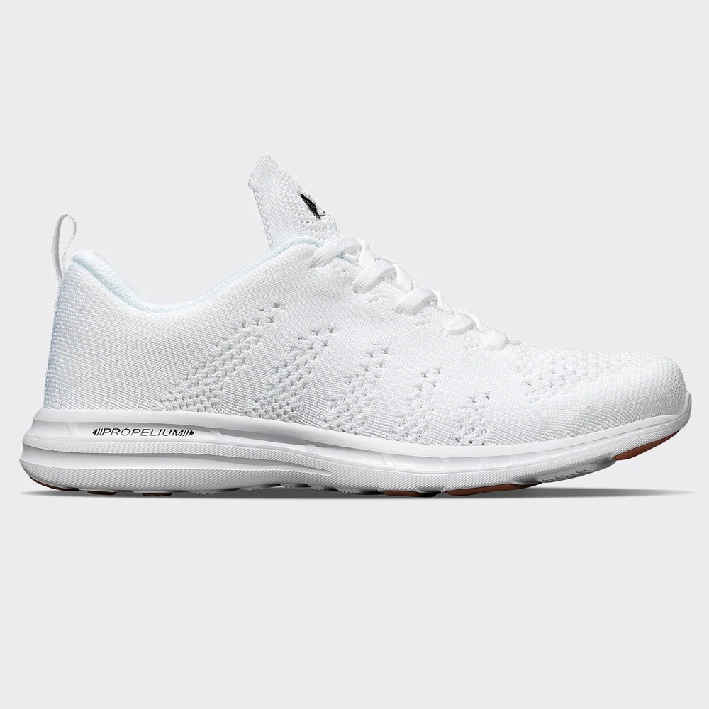 Okay. Maybe you insist on getting a clunkier pair. Maybe give Athletic Propulsion Labs Techloom a try. The brand has a claim to fame as being banned by the NBA because they provided too much assistance to players’ vertical leap. You can only imagine the spring they will provide to your step. As a note, it is suggested you go up a half size from your typical size selection. Here, I went with a solid white pair that should make it easier to work into outfits.