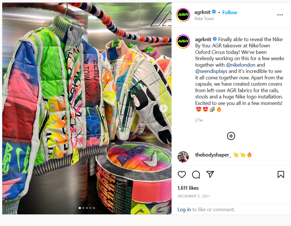 In December of 2021, AGR put on an event with Nike called Nike By You. It took place at NikeTown London. In the experience, Nike members were able to get limited edition product that had been upcycled by Alicia Robinson. This meant Nike materials that may have originally destined for trash were altered to become one-of-a-kind pieces in the hands of the AGR founder. The experience also featured a talk Robinson on the topics of sustainability in fashion.