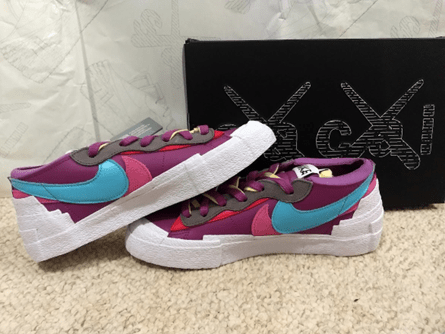 Fast forward to the shoes arriving, and sigh, I really wanted to hate these. At least one of the pairs, but alas I do not. They are all fire. I have here three color ways of the Nike x Sacai blazer lows: White patent leather, Kaws blue, and Kaws purple dusk.