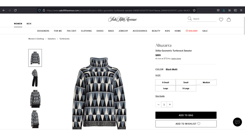One last thing that I find interesting is that the recommendations on the Amazon page are all around the specific designer, whereas the AI for Saks generated a list of sweaters that share similarities to this one.
