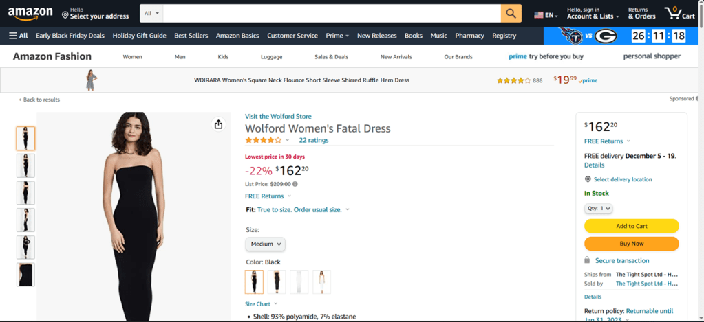The Amazon page is a bit busier and centers price and its trademark returns/shipping reputation. They also have a note about the designer to educate the site visitor.