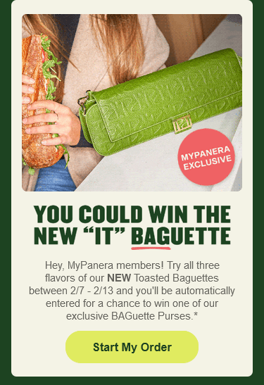 The fast casual chain is running a giveaway as a promotion for their new trio of sandwiches. Guests who buy all three between February 7 and 13 will be automatically entered to win a baguette shaped bag. Based on the terms and conditions, there will be three lucky people receiving these bags, valued at $100. I deliberated if that were feasible for me get one of each — Green Goddess Caprese Melt, Pepperoni Mozzarella Melt, and the Smoky Buffalo Chicken Melt– in the given time frame. I am unashamedly a sucker for free things that require me to make purchase first, but it may be a bit excessive for me. But since you almost got me, touché Panera marketing team, touché.