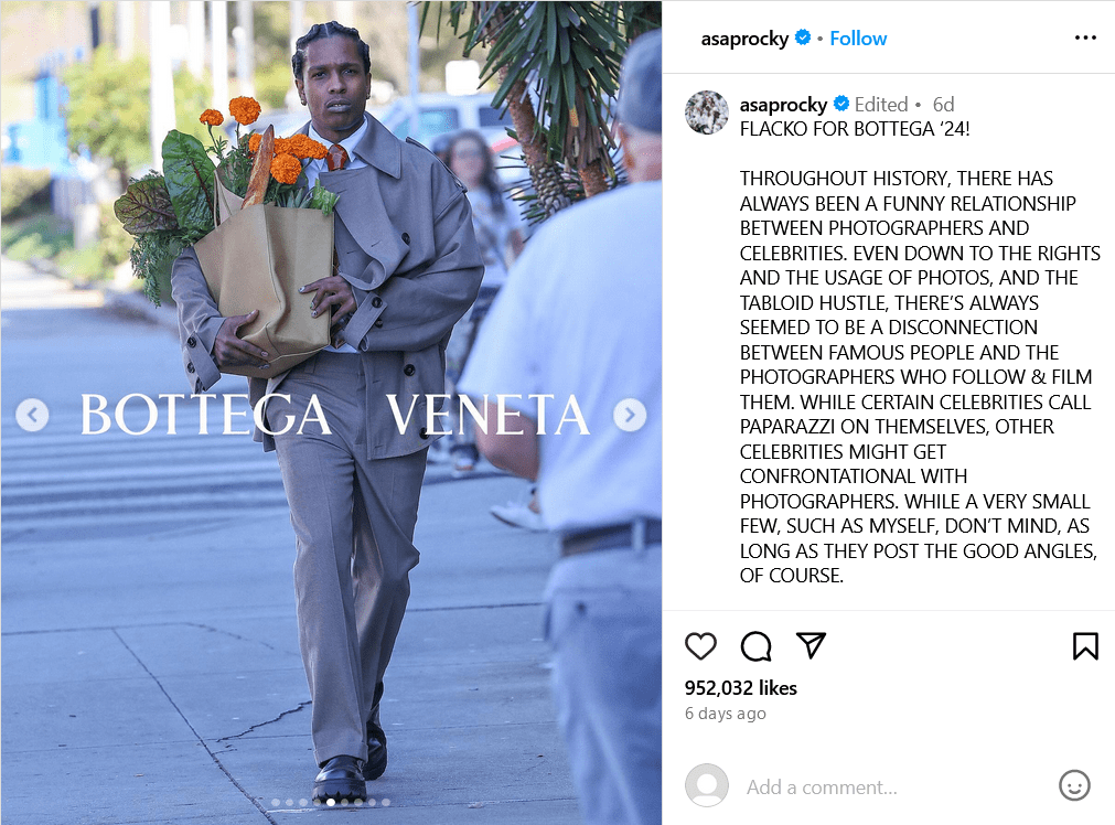 Kendall Jenner is out walking her dog in full glam. The paparazzi flock to her. A$AP Rocky goes out dinner. The paparazzi ensure they get all the images of him and Rihanna. The cycle repeats as the two go about their respective days in impeccable style. Vogue uploads articles about the two, fashionistas post about their fashion sense, and the whole fashion world dissects how to get the look. Months later those same images are posted on the respective social media pages, this time with the trademark white Bottega Veneta writing across the pictures. It was a campaign all the long.