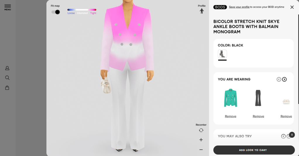 In a move to address the online returns rate, companies have turned to tech, like gaming tech. The company BODS has developed a virtual try-on tool to improve online shopping. By using your photos and/or biometric information, it creates avatars that can be customized to help you visualize how clothes might fit. Multiple brands are signed on and will be making this available on their websites. My curiosity got me, and I started to explore this tool with the upcoming collection from Balmain.
