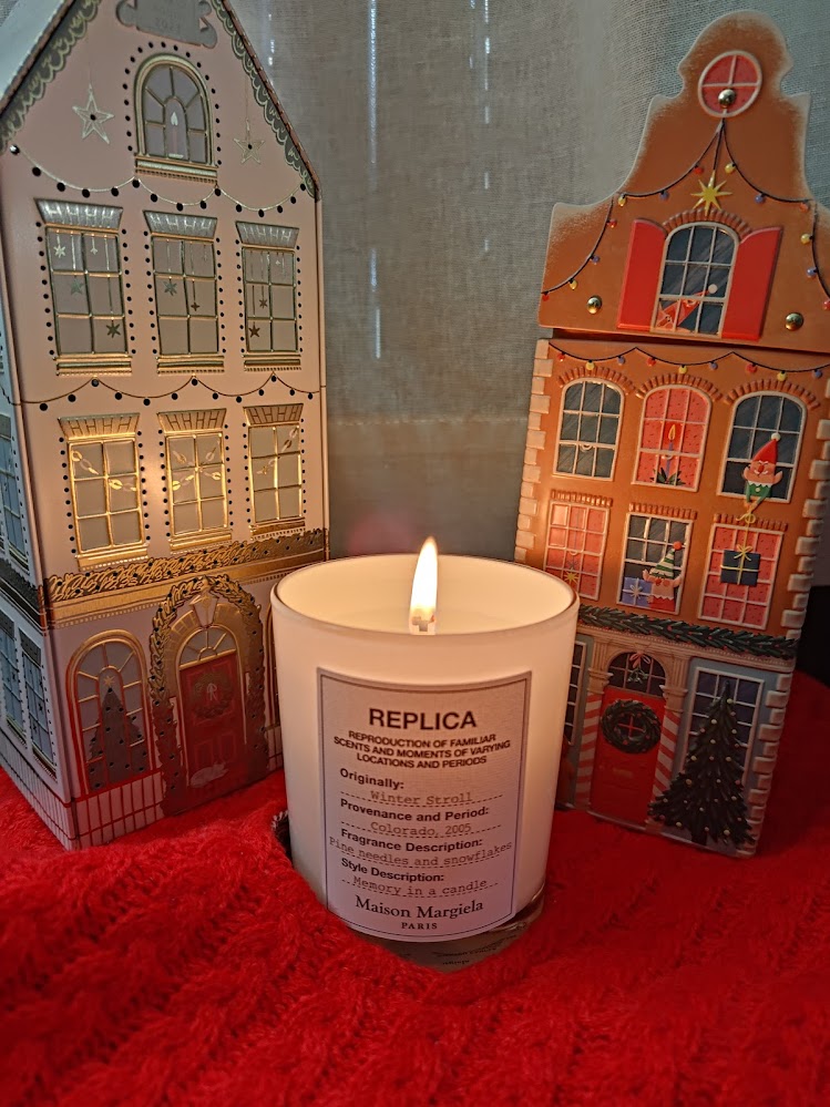 I finally put up my tiny Christmas tree, dressed it in ornaments, and set up my Christmas Village (aka cookie tins I got from Target). I was feeling festive. It was finally time to burn Winter Stroll from Replica by Maison Margiela.