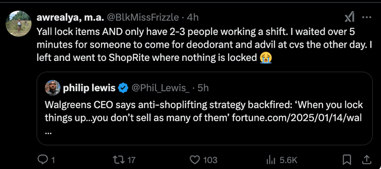 Cho, R. (January 15, 2025). Walgreens CEO Admits Locking Items Up Was Bad For Business, Consumers React. Yahoo News, reposted from Vibe. https://finance.yahoo.com/news/walgreens-ceo-admits-locking-items-200812537.html