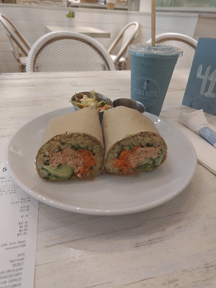 Luckily it was bright daylight on a busy day. Otherwise, I never would have taken the chance to try the blue Coco Azul smoothie. I also ordered the Spicy Tuna wrap, which was not spicy, at all. The meal was filling but did not live up to the hype.